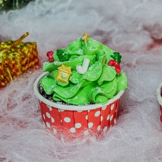 Enjoy a moist chocolate chip cupcake filled with rich chocolate ganache and topped with smooth green buttercream and sprinkles; a decadent eggless chocolate cupcake with a creamy Biscoff filling, green frosting, and an adorable edible mini candy cane; and a classic Red Velvet cupcake bursting with Nutella, finished with a buttercream swirl and holiday sprinkles. A joyful trio crafted to impress in every bite!